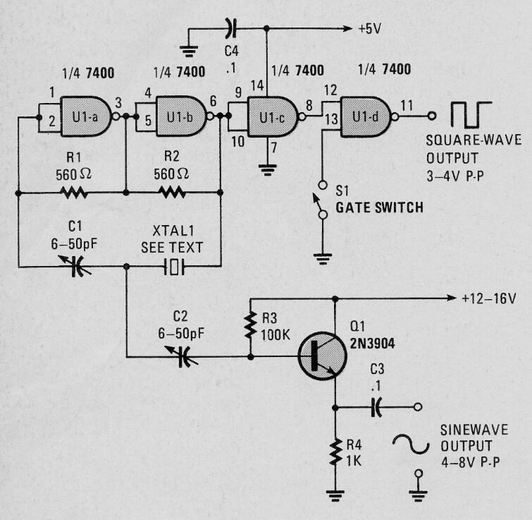 Este circuito es de una revista estadounidense Popular Electronics de marzo de 1991. El circuito produce señales rectangulares y sinusoidales de hasta 10 MHz, dependiendo del cristal utilizado. También se puede utilizar un transistor BC548 en lugar del original. Los condensadores ajustan el punto de oscilación y también la forma de onda de la señal sinusoidal. La alimentación debe realizarse con una tensión de 5 V.