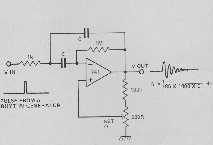 Este circuito se obtuvo en una publicación de 1978. El amplificador operacional debe usar una fuente simétrica. Un pulso, de un generador de ritmo, por ejemplo, genera una oscilación amortiguada que corresponde a un sonido de percusión. El circuito se puede utilizar en instrumentos musicales, timbres y otros efectos de sonido. La amortiguación se ajusta en el trimpot y la salida debe aplicarse a un amplificador.