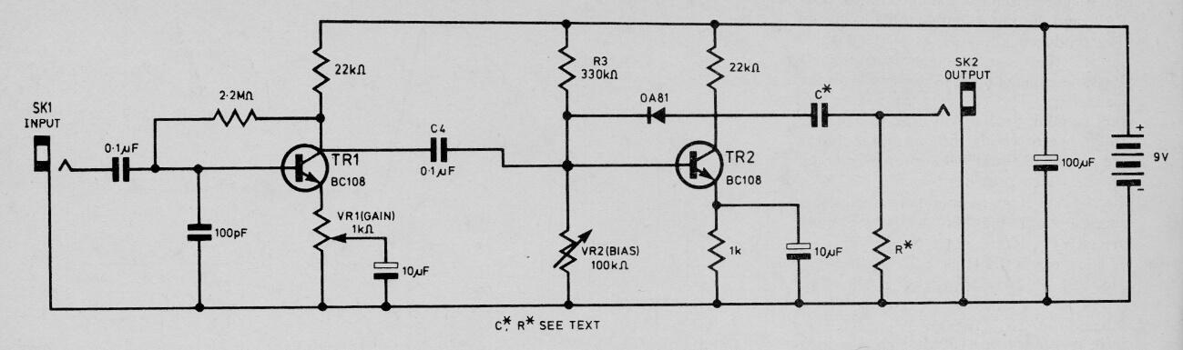 Este efecto para guitarra se encontró en una revista inglesa de 1978. Los transistores pueden ser el BC548 más moderno y la fuente de alimentación de 9 V, ya que el consumo es muy bajo. El resistor R puede ser de 2,2 k y el capacitor C de 2,2 nF, pero el ensamblador puede experimentar para obtener los mejores valores para los efectos deseados. El circuito está intercalado entre el instrumento y la entrada del amplificador. Deben utilizarse cables blindados para las señales de entrada y salida.