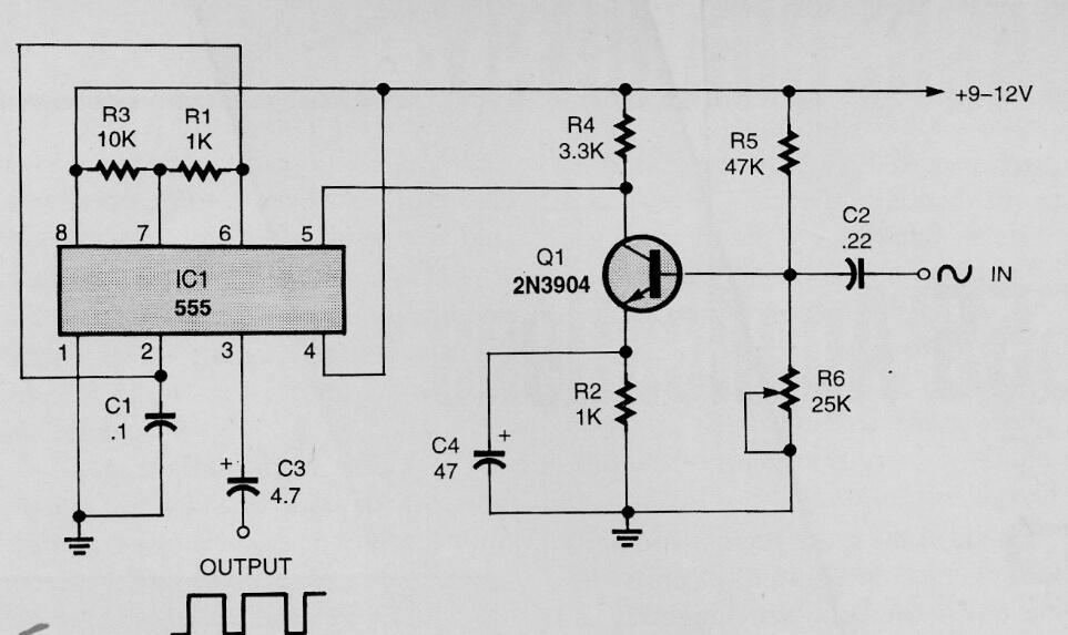 En este circuito mostramos cómo modular los pulsos producidos por un 555 en frecuencia. El circuito se puede utilizar en un enlace de audio utilizando un NE567 como decodificador. La frecuencia del 555 debe ser de 50 kHz o superior para la modulación en una pista de audio. El transistor también puede ser el BC548. El circuito es de una revista Poptronics de 2000.