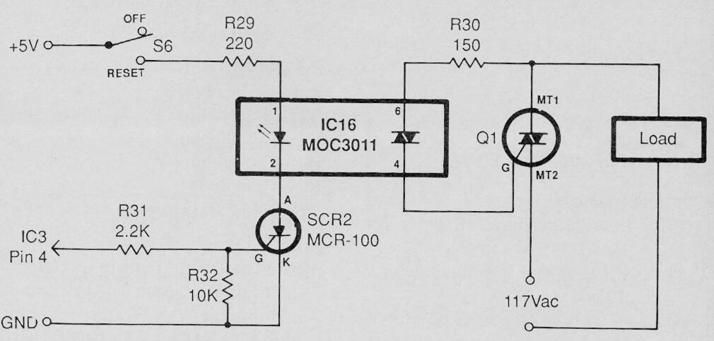 Este circuito de shield es de una revista Modern Electronics de 1990. En el original hay algunos problemas a considerar que la caída de tensión en SCR2, que puede ser un TIC106. Por lo tanto, puede ser necesario utilizar una tensión más alta en la alimentación con el intercambio de R29. El circuito controla directamente una carga en la red de CA de 110 V (117 V) y la potencia depende del triac, que puede ser cualquiera de la serie TIC.