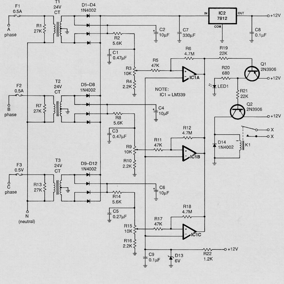 Este circuito es de Modern Electronics de abril de 1990. El circuito se puede ensamblar con transistores BC558. Los transformadores tienen al menos 200 mA de corriente secundaria. Lo que hace este circuito es que activa un relé cuando falta una de las fases que alimenta un motor. Los pinos de los comparadores LM339 no se muestran en el diagrama. Asegúrese de incluir los pinos de alimentación de este componente.