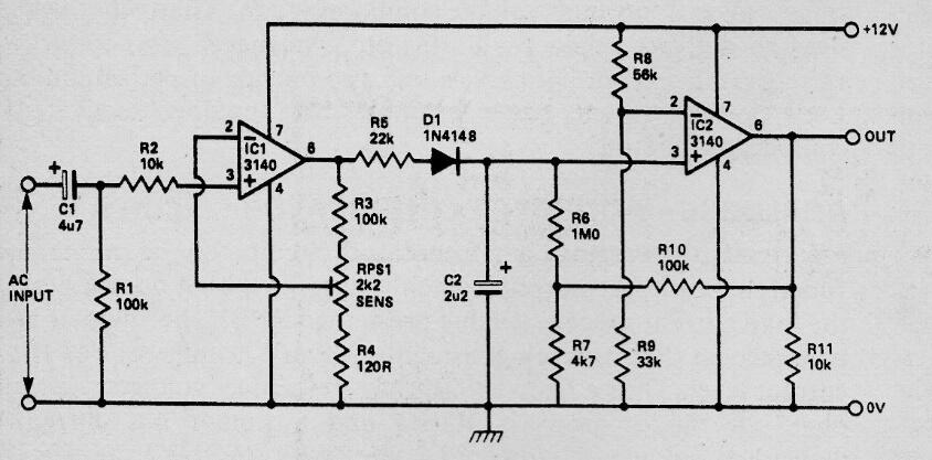Este circuito utiliza los amplificadores operacionales con FET CA3140, pero se pueden probar equivalentes. El circuito opera con señales de entrada en el rango de 6 mV a 11 mV, establecido en RV1. El circuito es de una publicación inglesa de 1982.
