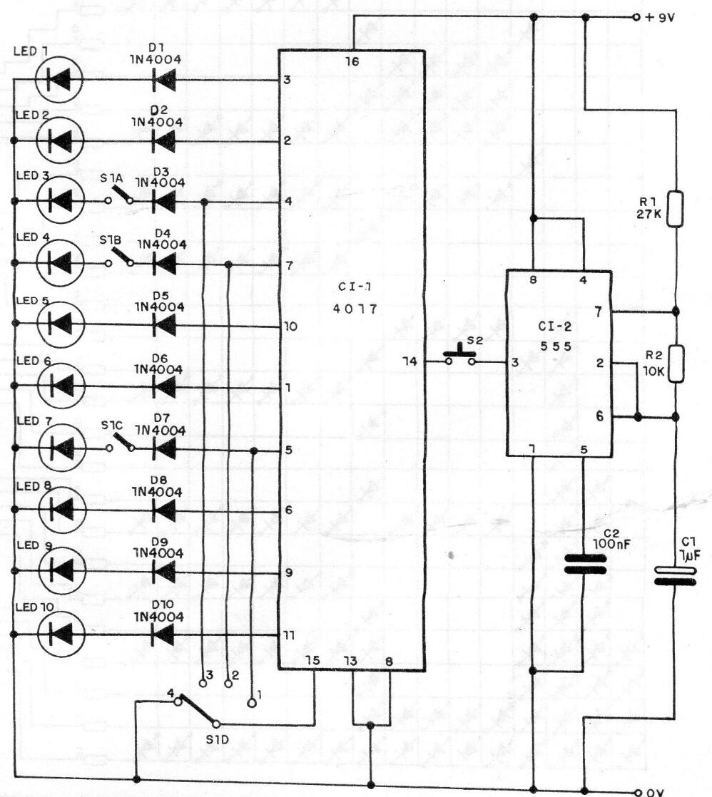 Este circuito es antiguo, lo que hace que los LED se enciendan secuencialmente. Se pueden programar varios tipos de juegos utilizando las llaves que detienen la secuencia o activan LEDs especiales de la secuencia que indican un movimiento diferente. El circuito puede ser alimentado por 4 baterías o por una batería de 9 V. Será interesante conectar un resistor de 470 ohmios del conjunto de LEDs a tierra.