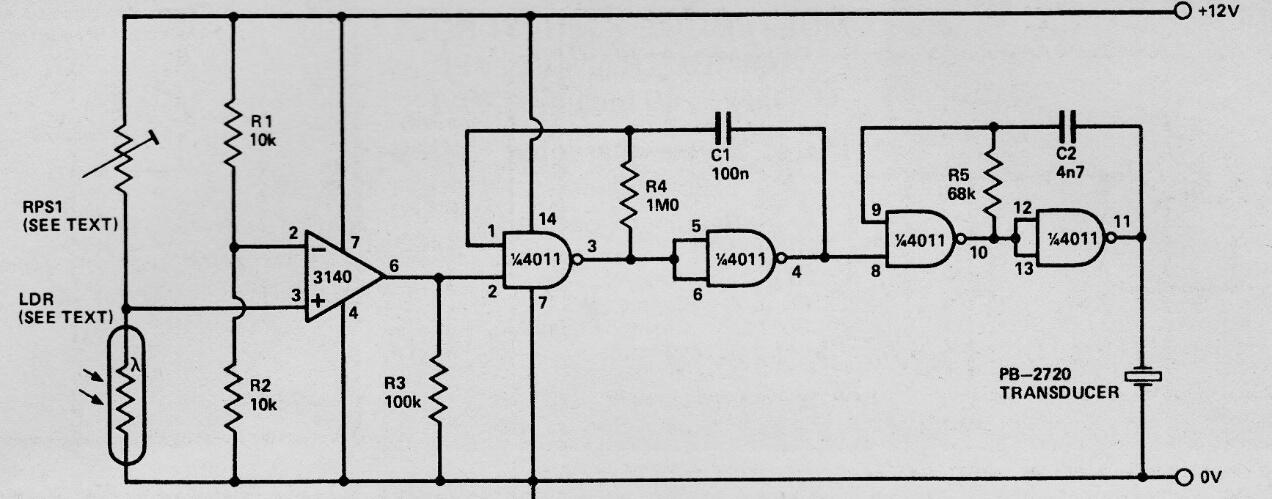 Este circuito se encontró en una publicación inglesa de 1982. El operacional puede ser reemplazado por un equivalente y el potenciómetro de ajuste puede estar entre 47k y 470k dependiendo de la intensidad de la luz en el ambiente de operación. El transductor es una cápsula piezoeléctrica y la alimentación se puede realizar con voltajes de 6 a 12 V, sin problemas. El sensor es un LDR de cualquier tipo.