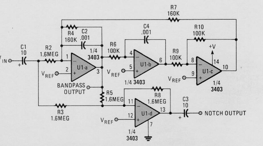 Este filtro de muesca utiliza cuatro amplificadores operacionales que pueden ser 741 en lugar de los originales. El circuito se obtuvo en una Electrónica Popular de 1993. La frecuencia viene dada por los capacitores. Vea en la sección de matemáticas para electrónica cómo calcular estos componentes de acuerdo con la frecuencia que desea rechazar. La potencia puede estar entre 9 y 12 V.