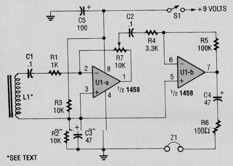 Este circuito se encontró en una Popular Electronics en 1993. El 1458 consta de un doble 555. El teléfono puede ser una cápsula magnética de baja impedancia o incluso una piezoeléctrica. La bobina es del tipo captador de teléfono, pero se puede improvisar envolviendo alrededor de 500 a 1000 espiras de alambre esmaltado muy fino en una pequeña varilla de ferrita. La alimentación consta de una batería de 9 V.