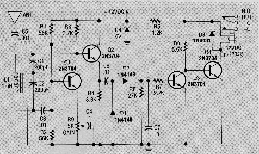 Esta alarma de aproximación se encontró en una Radio Electronics de julio de 1990. El circuito debe estar alimentado por una fuente con buen filtrado y los transistores pueden ser el BC548. Los otros componentes no son críticos excepto L1, que eventualmente debe cambiarse. El potenciómetro de ganancia puede ser de 4k7.