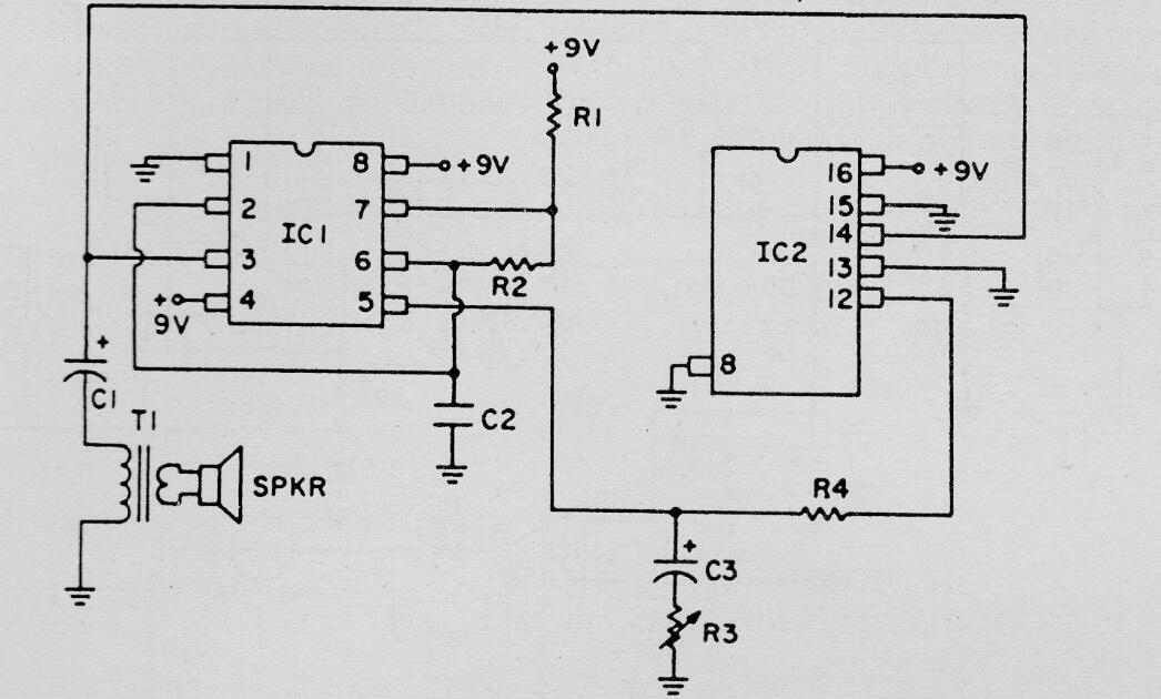 Este circuito es de un Electronics Handbook de 1992. El circuito genera un efecto de tono especial para una alarma, y ??se puede usar una etapa de amplificador de potencia en lugar de T1. La alimentación se puede realizar con tensiones de 5 a 12 V y el efecto se puede cambiar con el cambio de capacitores. El transformador se puede obtener de radios de transistores antiguos.