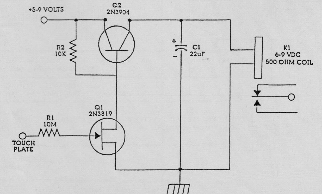 Encontramos este interruptor de toque en un Electronics Handbook de 1992. El circuito se puede ensamblar con relés de 6 o 12 V, cambiando el suministro a este voltaje. El emisor de transistor debe estar conectado al positivo, que faltaba en el diseño de publicación original. El FET puede ser un BF245 o MPF102. Nunca alimente este circuito con una fuente sin un transformador, por razones de seguridad.