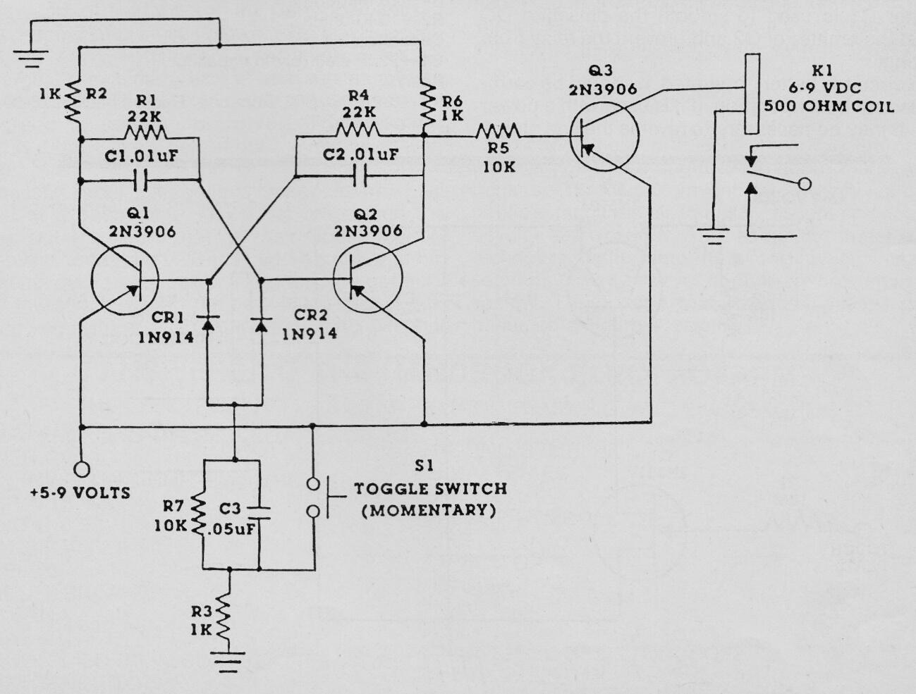 Los transistores de este circuito que se encuentran en un Electronics Handbook de 1992 pueden ser el BC558 y la alimentación de 6 V que se utilizará con un relé de esta tensión. El circuito es impulsado por un interruptor de presión o un sensor NO. No utilice una fuente sin transformador para alimentar este circuito.