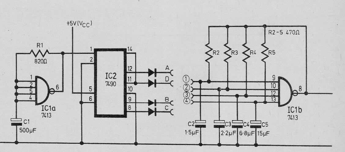 Este circuito fue encontrado en una publicación inglesa de 1976. Genera señales secuenciales en los diodos, que pueden ser del tipo 1N4148 y que son convertidas en tonos por el oscilador con el 7413. El circuito debe ser alimentado por 5 V ya que usa tecnología TTL. La frecuencia de los pulsos depende de C1, que puede ser un capacitor de 470uF.