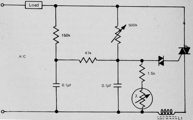 Este circuito enciende lámparas incandescentes (no use ningún otro tipo) cuando oscurece. El circuito se encontró en una publicación de 1980 y funciona con Triacs de la serie ICT. El triac debe tener un radiador de calor y el sensor es un LDR común. L1 consta de 20 vueltas de alambre 18 o 20 en una varilla de ferrita.