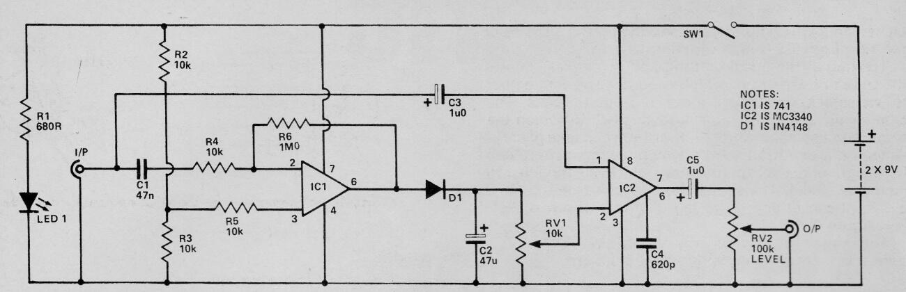 Este circuito es de una publicación de 1980. El circuito tiene alta ganancia con señales débiles y menor ganancia con señales fuertes. Se puede usar otro amplificador para IC2 y la alimentación puede provenir de la fuente. El indicador LED es opcional y el diodo D1 también admite equivalentes.
