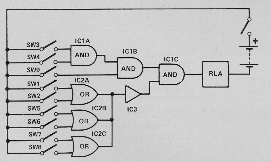 Encontramos este circuito en una publicación de 1978. Proporciona una combinación diferente para sensores de alarma conectados en paralelo. En este circuito, RLA es un relé de láminas, pero se puede utilizar un relé común con un paso de excitación transistorizado. El suministro debe realizarse con tensión según la lógica y el relé utilizado.