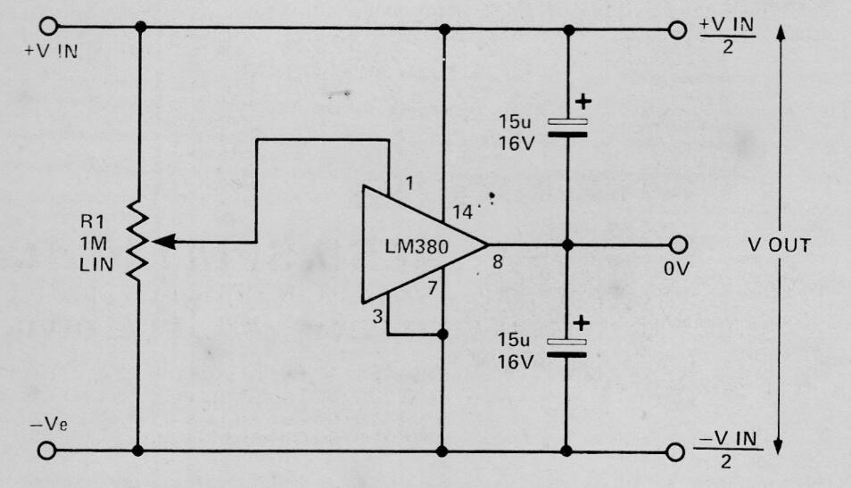 Se pueden obtener corrientes de unas pocas decenas de miliamperes con esta fuente simple que hace uso de un amplificador de audio integrado. El circuito es de una publicación de 1978. La tensión de entrada máxima es de 20 V y el potenciómetro está ajustado para dividir la tensión de entrada por 2.