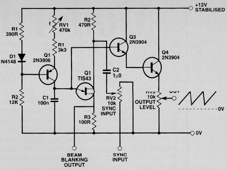 Este circuito es de una publicación de 1991, pero se puede ensamblar con componentes más modernos. Podemos usar 2N2646 para Q1 (unijuntura) y BC548 para los otros transistores. Consulte la sección de componentes de electrónica sobre cómo calcular C1 para la frecuencia deseada. La señal está en el rango de audio y se puede utilizar como base de tiempo para un osciloscopio experimental de baja frecuencia.