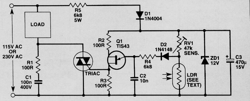 En este circuito de una publicación de 1991, podemos usar el transistor de unión única 2N2646 y el sensor es cualquier LDR. El triac puede ser cualquiera de la serie TIC con corriente según la carga controlada. LDR es común y la sensibilidad se ajusta en RV1. El Triac debe estar equipado con un radiador de calor en función de la carga. Este circuito no usa un transformador.