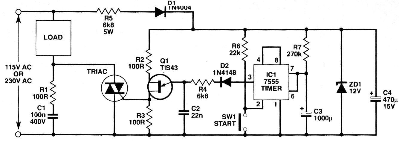 En este circuito de una publicación de 1991 podemos usar el transistor uniuntura 2N2646 y el triac puede ser cualquiera de la serie TIC con corriente según la carga controlada. El Triac debe estar equipado con un radiador de calor en función de la carga. El circuito apaga una carga después del tiempo determinado por R7 y C3. Vea en la sección de matemáticas cómo calcular estos componentes para los tiempos deseados.