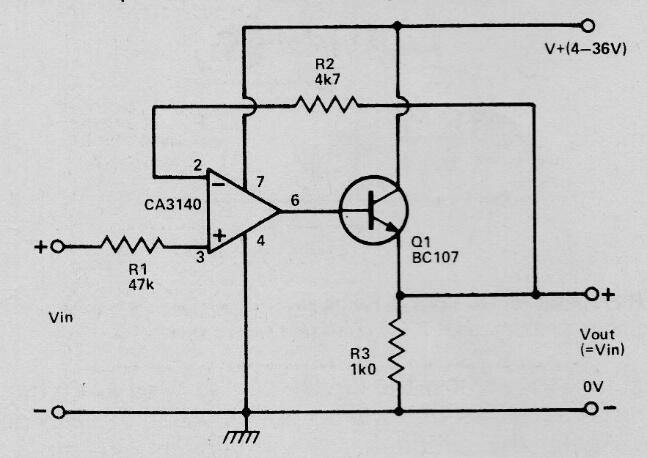 Este seguidor de CA3140 se encontró en una publicación de 1991. El transistor puede ser el BC548 y la impedancia de entrada es muy alta. La ganancia de tensión es unitaria y la fuente de alimentación no necesita ser simétrica. La corriente de salida máxima es de alrededor de 50 mA. Se pueden utilizar amplificadores operacionales equivalentes.