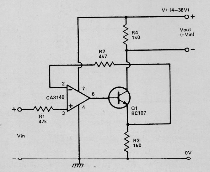 Este circuito se obtuvo en una publicación de 1991. Lo que hace es amplificar una señal con ganancia unitaria, pero en relación a la referencia positiva. Este es un circuito conocido como "translator". La salida se ve reforzada por la presencia del transistor, que puede ser un BC548. La impedancia de entrada es alta y la corriente de salida máxima está determinada por los resistores R3 y R4.