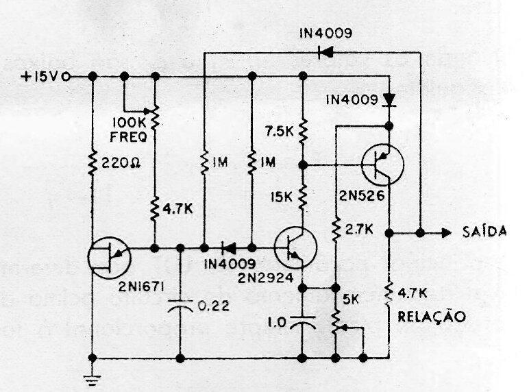 Este generador de pulsos fue encontrado en una publicación de 1967. Podemos ensamblarlo con el unijuntura 2N2646 y para bipolar podemos usar el par BC548 y BC558. El circuito produce pulsos cortos establecidos en los potenciómetros.