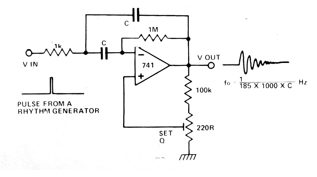 Un pulso de entrada produce una oscilación amortiguada en la salida de este circuito que se ve en otra parte de este sitio. El circuito es de una publicación inglesa de 1980, sugerido para producir el sonido de una campana o triángulo en una campana electrónica. La fuente de alimentación debe ser simétrica y se pueden utilizar otros amplificadores operacionales.