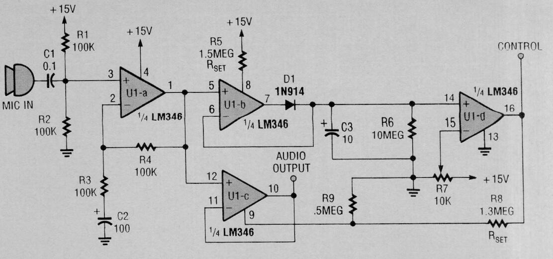 Este circuito de un interruptor controlado por voz, Vox o interruptor sónico se obtuvo en una Popular Electronics de la década de 1980. La salida debe aplicarse a una etapa de potencia, por ejemplo, un transistor que opera un relé. El circuito también tiene una salida de audio que actúa como preamplificador. Se pueden utilizar amplificadores operacionales equivalentes y no es necesario que la fuente sea simétrica.