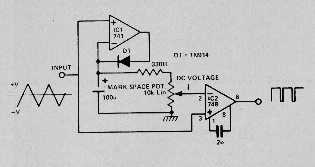 Este circuito se encontró en una publicación de 1980. Este circuito convierte una señal de entrada triangular en una señal rectangular con una marca de espacio variable. El circuito puede utilizar otros operacionales y la fuente de alimentación debe ser simétrica.
