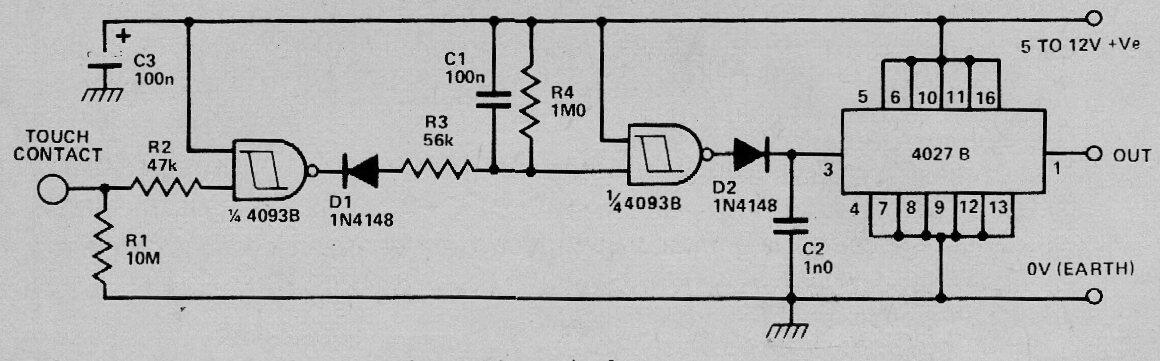 Encontramos este circuito en una publicación inglesa de 1980. Proporciona una señal de salida lógica cuando se toca el sensor. La señal se puede utilizar para activar un paso de potencia o un relé. El circuito es biestable, es decir, cambia de estado con el tacto. La alimentación se puede realizar con tensiones de 5 a 12 V. Nunca utilice una fuente sin transformador para alimentar este circuito.