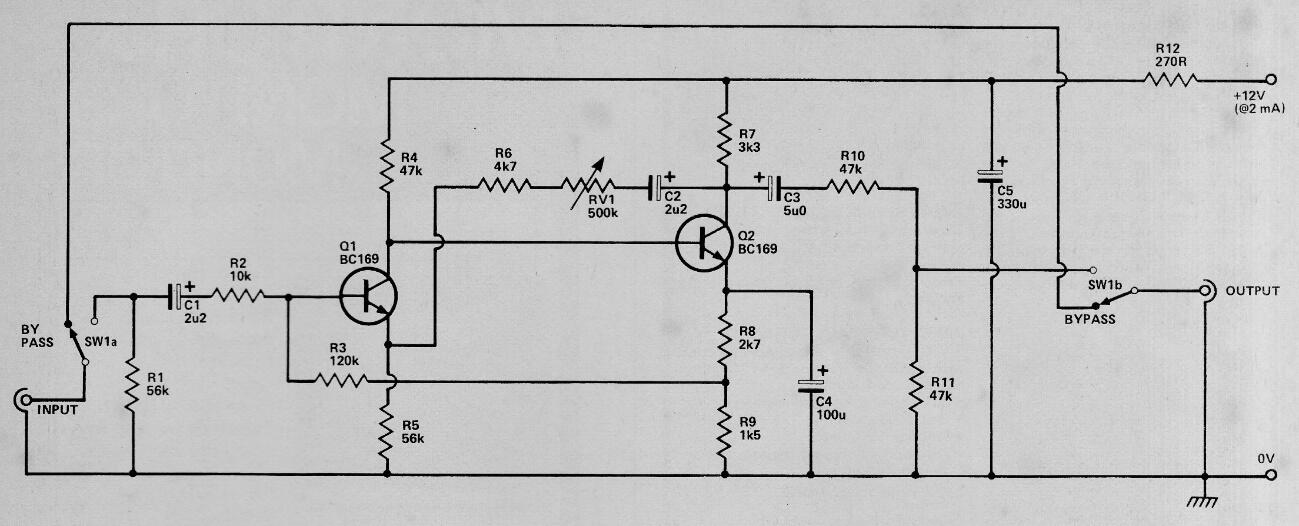 Este circuito es de una publicación de 1980, pero aún se puede ensamblar con transistores BC548 a Q1 y BC549 a Q2. El circuito es de bajo consumo y los cables de entrada y salida de señal deben estar apantallados. La ganancia del circuito se ajusta en RV1.