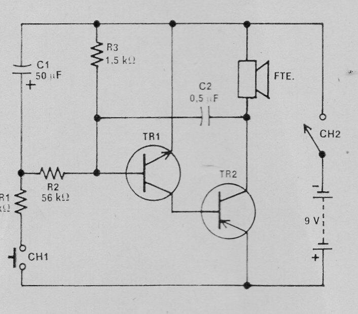 Esta conocida configuración de oscilador que produce un sonido de sirena al presionar CH1 es de una publicación de 1972. Puede montarse con transistores BC548 para TR1 y BD136 para TR2. La alimentación se puede hacer con tensiones de 5 a 12 V. C2 puede ser de 470nF determinando el tono producido.