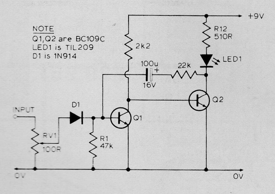 Los transistores para este proyecto de una revista de 1992 pueden ser BC548 o BC549 y el diodo puede ser 1N4148. El LED puede ser de cualquier tipo y el trimpot RV1 ajusta la tensión de disparo.