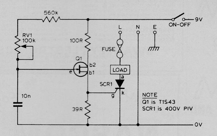 Este circuito, que se encuentra en una publicación de 1978, produce efectos pulsantes en una lámpara incandescente de hasta 200 W. El SCR puede ser el TIC106 y el unijuntura 2N2646. Experimente con diferentes valores para el capacitor de 10 nF hasta que obtenga los efectos deseados.