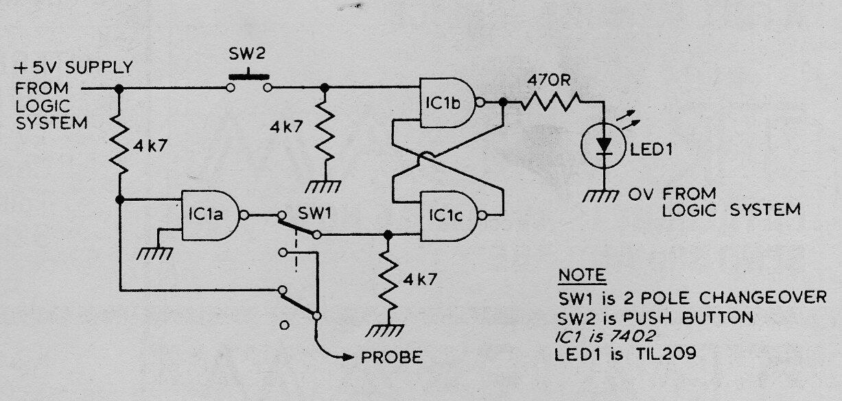 Este circuito detecta picos de ruido en la fuente de un sistema lógico y se restablece presionando SW2. El circuito es de una publicación de 1978 y se puede utilizar para detectar picos en otros puntos del circuito a través de la sonda lógica. El circuito debe alimentarse con 5 V ya que utiliza tecnología TTL.