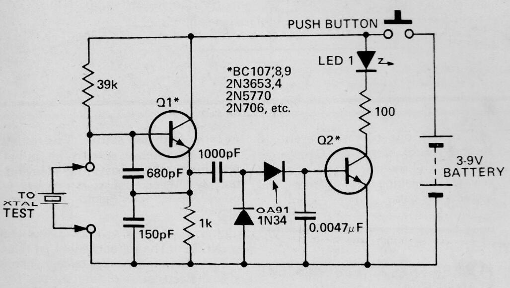 Encontramos este circuito en una publicación de 1976. Los transistores pueden ser BC547 o 2N2222. Se pueden probar cristales de hasta unas pocas decenas de megahercios. El LED puede ser de cualquier tipo. Todos los capacitores deben ser de cerámica.