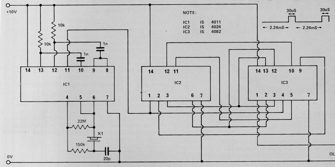 El cristal de este circuito es de 32,758 kHz utilizado en TV. El circuito se obtuvo en una publicación inglesa de 1977, pudiendo generar un tono de 440 Hz para afinar instrumentos musicales. La salida debe estar conectada a la entrada de un amplificador. La señal producida es rectangular y la fuente de alimentación puede estar entre 9 y 12 V.