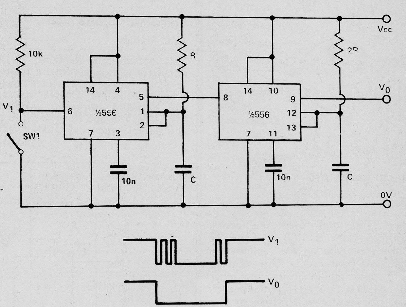 Este circuito, de una documentación de 1977, utiliza dos 555 o un 556 (doble 555), pudiendo operar con tensiones de 5 a 15 VO circuito elimina el rebote y R / C debe obtenerse en el tiempo de conmutación deseado, es decir la duración del pulso de salida.