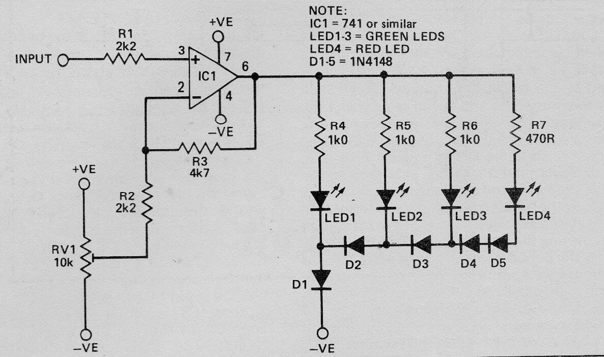 Encontramos este circuito en una documentación de 1985. El gráfico de barras de 4 LED (bargraph) está excitado por una tensión de entrada. La alimentación debe ser simétrica de 6 a 9 V y los diodos son comunes para propósito general. El ajuste de escala se realiza en el potenciómetro.