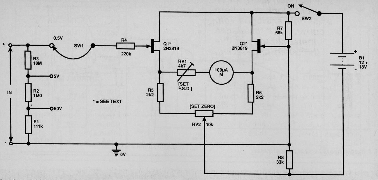 Esta configuración muy común de un voltímetro de alta resistencia de entrada se obtuvo en una documentación de 1993. Los FET pueden ser BF245 o MPF102. RV1 ajusta la escala completa y RV2 el punto nulo. El voltímetro tiene tres escalas con una resistencia de entrada de 10 M ohms. El circuito también se puede alimentar con una batería de 9 V. La precisión depende de la tolerancia de los resistores utilizados.