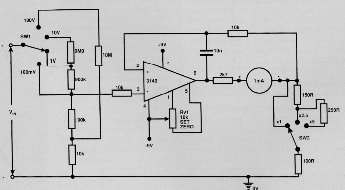 Obtuvimos este circuito de una documentación de 1993. El circuito tiene 7 rangos de corriente que se seleccionan mediante dos interruptores. El circuito puede ser alimentado por dos baterías de 9 V. La precisión dependerá de la tolerancia de los resistores utilizados.