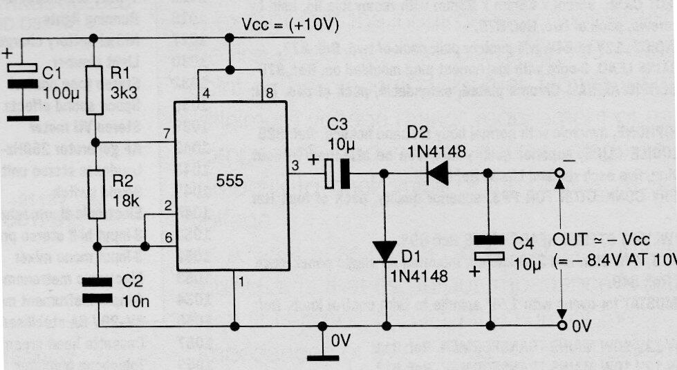 Esta configuración se puede encontrar en otros artículos de este sitio. Este se obtuvo en la documentación de 1998. Genera una tensión negativa a muy baja corriente, sirviendo para la polarización, por ejemplo, de interruptores analógico-digitales. La tensión de entrada máxima es de 15 V.
