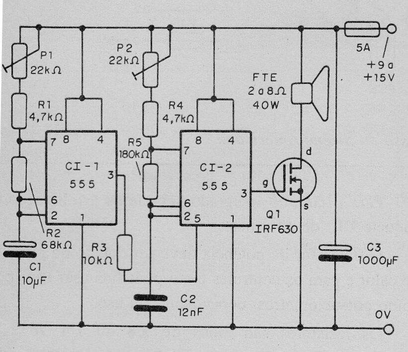Este circuito genera un tono de frecuencia modulada con excelente potencia. Se pueden utilizar otros MOSFET de potencia, que deben estar equipados con buenos radiadores de calor. El circuito debe estar alimentado por una fuente de al menos 2 A o batería. Los ajustes son para frecuencia y modulación. El altavoz debe tener al menos 40 W con buen rendimiento.