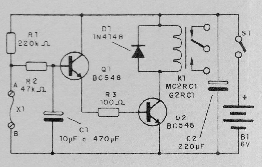 En la condición de espera, el consumo de esta alarma es extremadamente bajo, del orden de los microamperes. El número de sensores conectados en serie es ilimitado y se puede utilizar un relé de 12 V para suministrar esta tensión. El relé puede ser un tipo más moderno. Los sensores consisten en pequeños cables que se enclavan en puertas o ventanas o en sensores de láminas tipo NC.