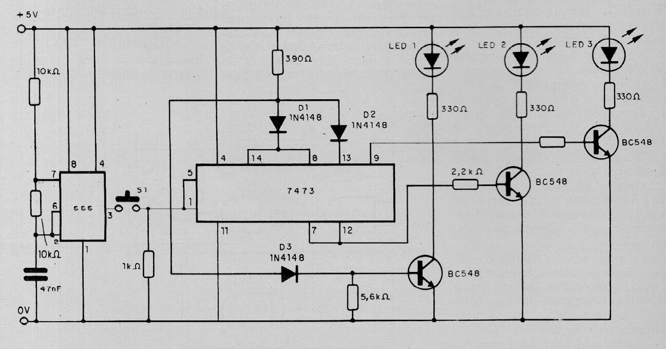 Este circuito dibuja una de las tres posibles conjeturas de un logotipo de lotería deportiva: columna 1, 2 o el medio. El circuito debe estar alimentado por una tensión de 5 V y puede utilizar LED de diferentes colores. Los otros componentes son comunes y la velocidad de extracción se puede cambiar cambiando el capacitor de 47nF. El sorteo se realiza presionando y soltando el interruptor S1.