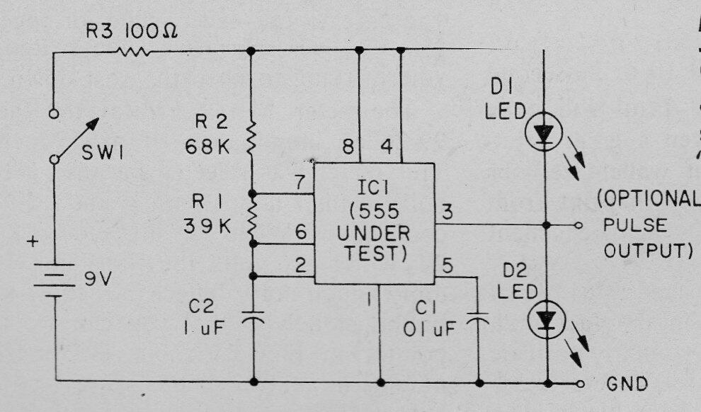 Encontramos este probador de circuito integrado 555 en una antigua Electronics Hobbyst de 1977. El circuito todavía tiene corriente y también se puede alimentar con 6 V. Si el 555 bajo prueba es bueno, los LED parpadearán alternativamente. El montaje sencillo se puede realizar en una matriz de contactos o en una placa con un enchufe para adaptarse al 555 bajo prueba.