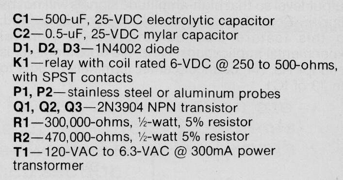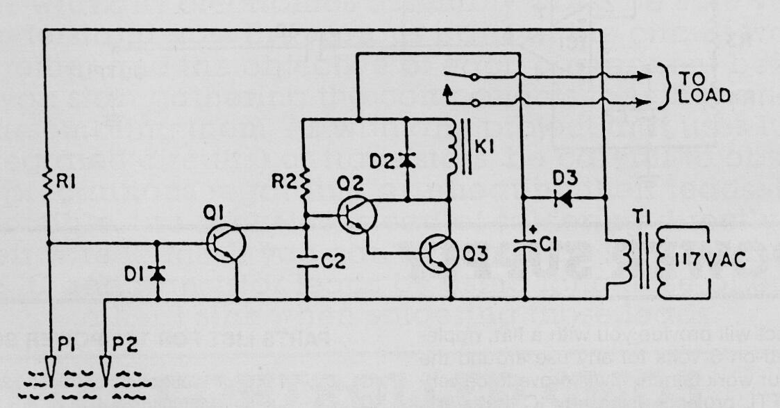 Este circuito se encontró en un Manual de electrónica de 1990. Sirve para indicar el nivel de líquidos, por ejemplo, cuando una caja de agua está llena o se produce un desbordamiento. Los transistores pueden ser el BC548 y los extremos de los cables desnudos de los sensores en contacto con el agua. El transformador también puede ser secundario de 12 V con 100 mA o más si el relé utilizado es de 12 V. R1 puede ser de 330 k ohms y C2 de 470nF.