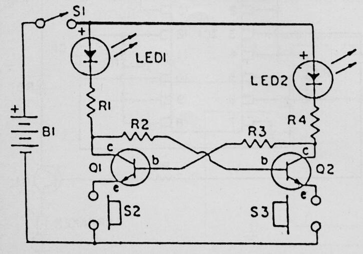 Este circuito fue encontrado en un Electronics Handbook de 1990. Los transistores también pueden ser el BC548 y la alimentación se puede hacer con tensiones de 6 a 15 V. Al presionar y mantener presionados los interruptores, solo el que se activó primero permanece encendido.