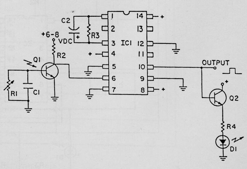 Encontrado en un Electronics Handbook de 1990, este circuito hace que un LED parpadee cuando el fototransistor recibe luz. Instalado en un robot, sirve para mostrar que el robot está viendo algo. El fototransistor puede ser de cualquier tipo y Q2 puede ser un BC548. La salida del circuito se puede utilizar para control externo.