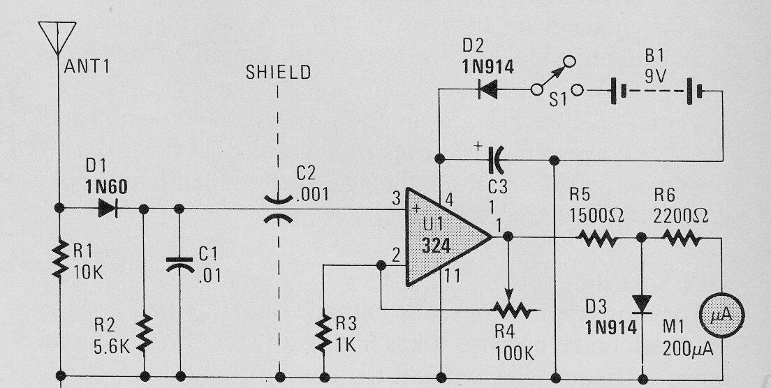 Este circuito es de una Hands-On Electronics de 1987, pero aún se puede ensamblar fácilmente, ya que todos los componentes siguen siendo comunes. U1 es un LM324, pero se pueden utilizar operaciones equivalentes. La antena es de tipo telescópico o un trozo de alambre rígido de al menos 30 cm de largo. El circuito opera en frecuencias de hasta más de 100 MHz, sirviendo para detectar la emisión de señales de transmisores e incluso el funcionamiento de osciladores.